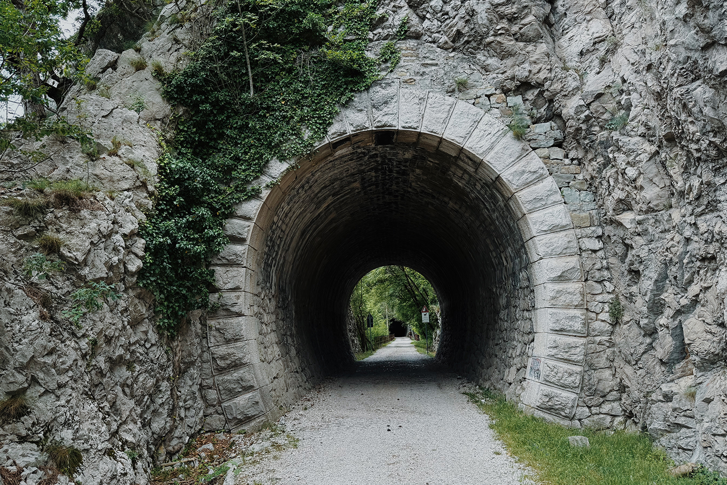Destinacijo sobotnega kolesarskega izleta sem izvedela šele, ko sva na robu Kozine, na makadamskem parkirišču, kjer opoldne ni bilo žive duše, zaklenila avto. Dejstvo, da sva se odpravljala na necestno turo bi mi Mr. P. sicer težko prikril, res pa je, da rekreativne poti, speljane po trasi opuščene železniške proge Hrpelje-Kozina-Trst, nisem poznala in se mi ni niti približno sanjalo, kaj me čaka. Bilo je sončno, zato je Mr. P. oblekel kratke rokave. Zaradi rahlega vetra je bilo tudi malce hladno, zato sem nase navlekla dolge. In sva šla.