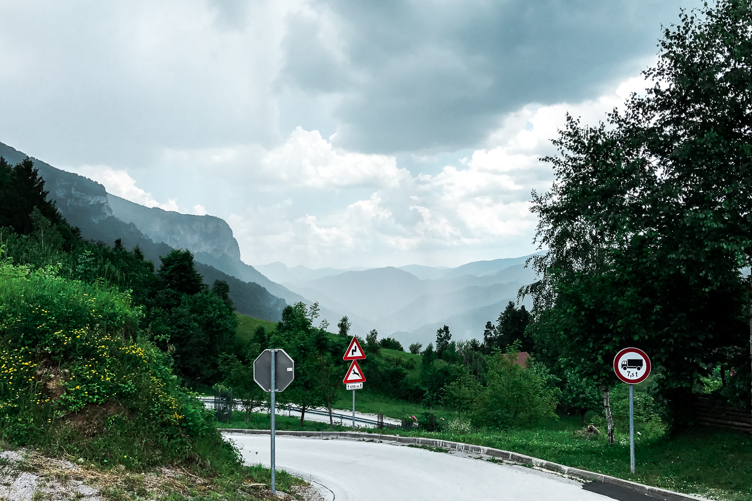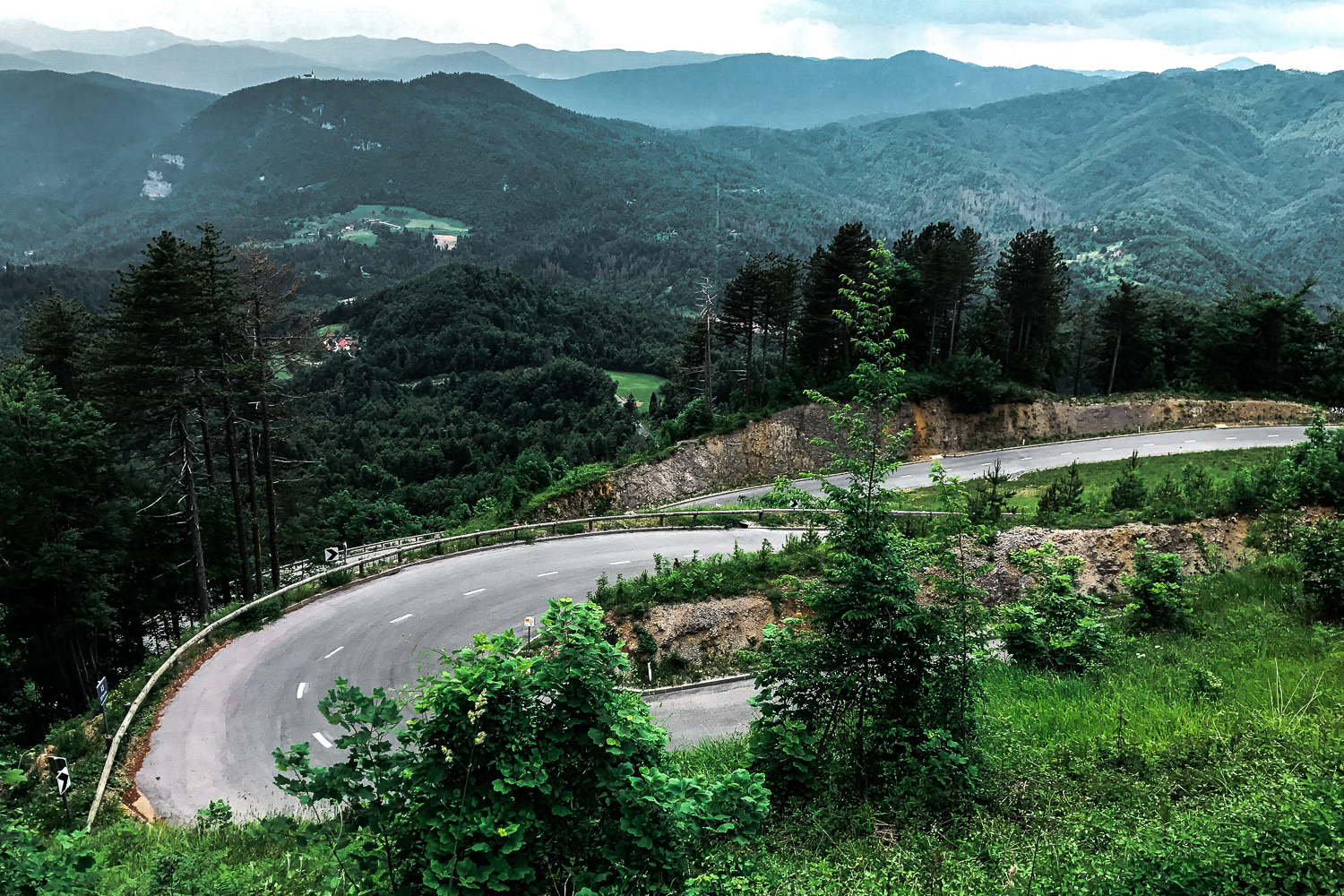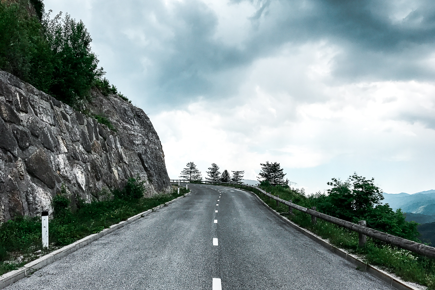 Tukaj se je že začel vzpon na prelaz Strma reber. Cesta je vse do vrha urejena na novo. Pravi raj tako za kolesarje kot tudi za motoriste. Tudi tukaj nisva srečala drugega kot kakšnega domačina. K sreči se je pooblačilo, saj bi drugače pri devetnajstih v skalo vklesanih serpentinah, kar poštenem naklonu in soncu do vrha kar pošteno garala. No, garala sva kljub temu, a je bilo bistveno lažje. Višje kot sva prišla, lepši so bili razgledi. Ves čas sva v daljavi lahko opazovala kako dež obliva sosednje hribčke. Dežni oblaki so se naju izogibali in drugega kot lastnega potu na obrazu nisva začutila.