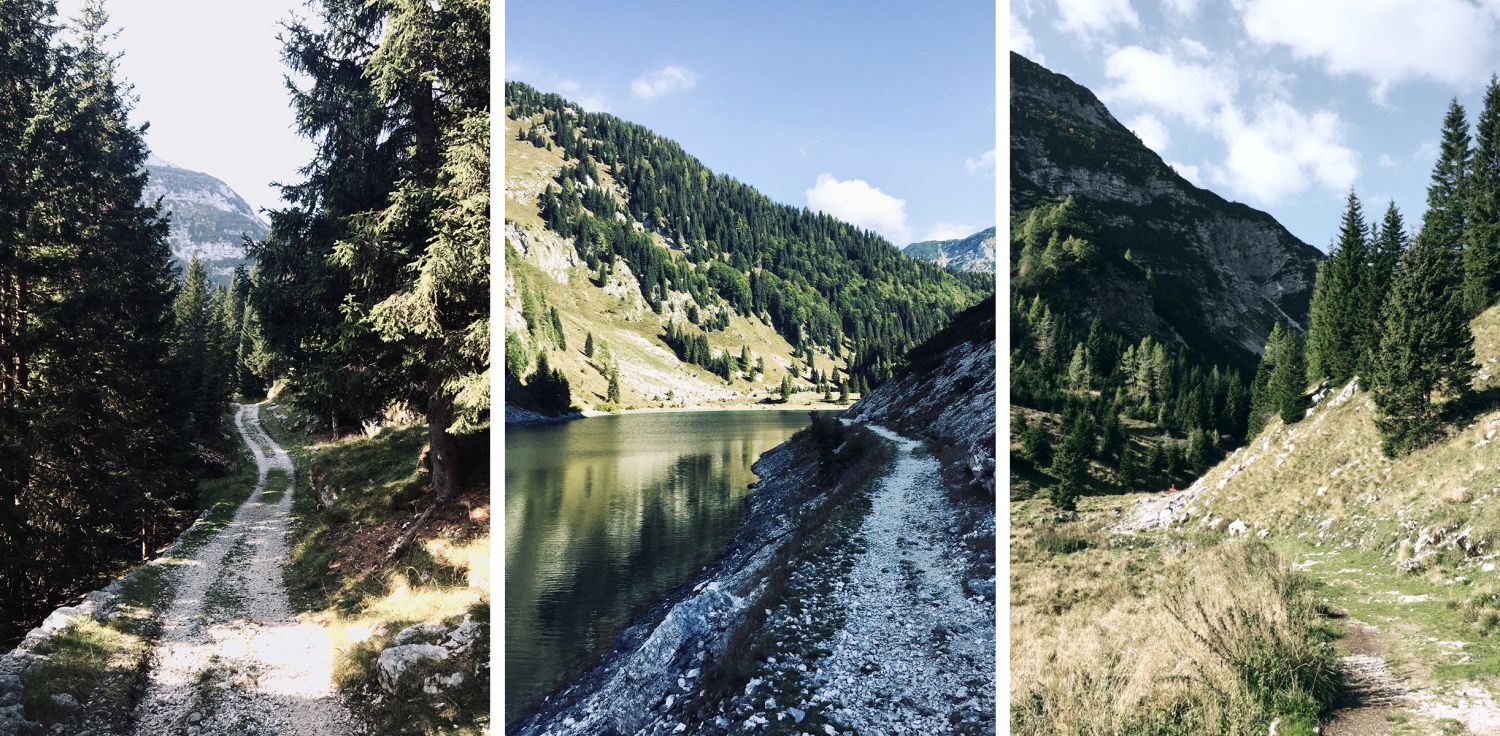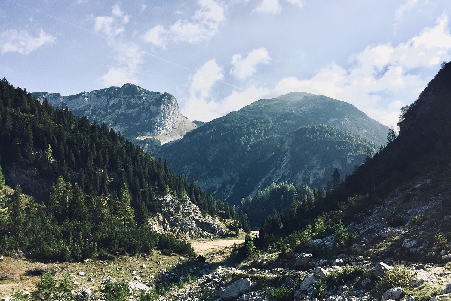 Potem ko sva v Lepeni, kjer sva pustila avto, prehitela trumo hrupnih ljubljanskih planincev, sva do vrha srečala le še peščico pohodnikov. Večji del se je pot nato serpentinasto dvigala po pretežno listnatem gozdu, pri tem večkrat prečila tovorno žičnico in se zravnala šele pri njeni zgornji postaji. Od tam sva imela do Krnskega jezera le še slabih dvajset minut.
