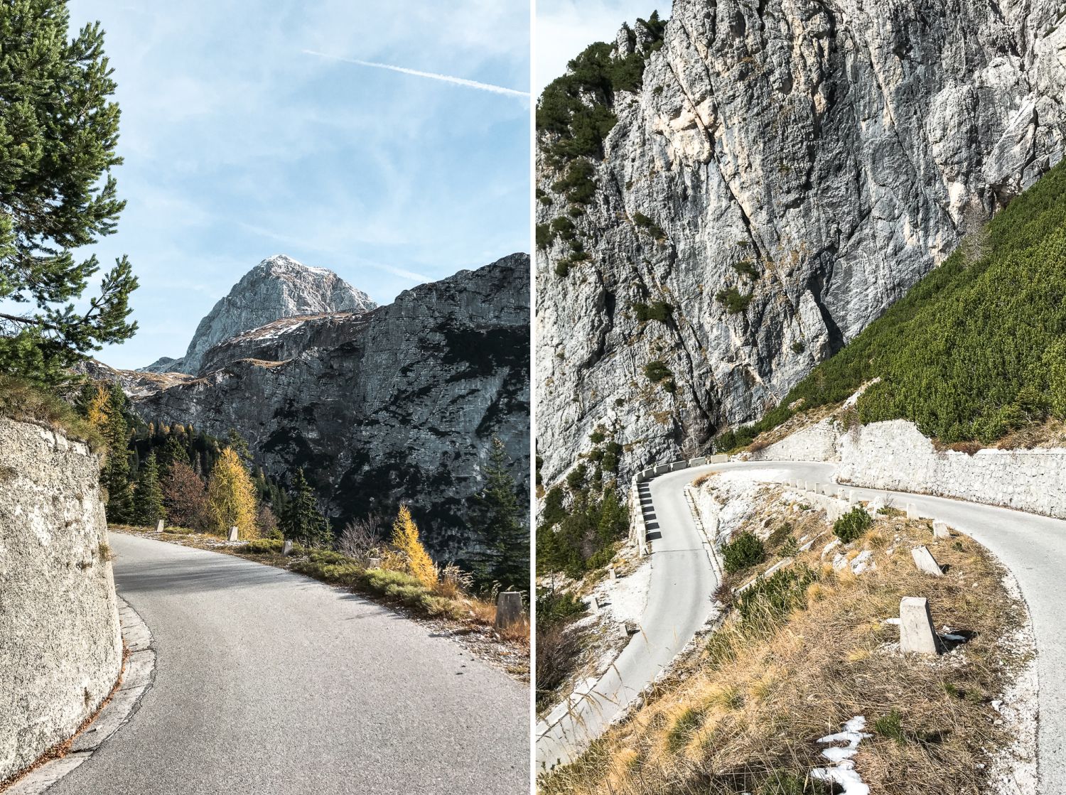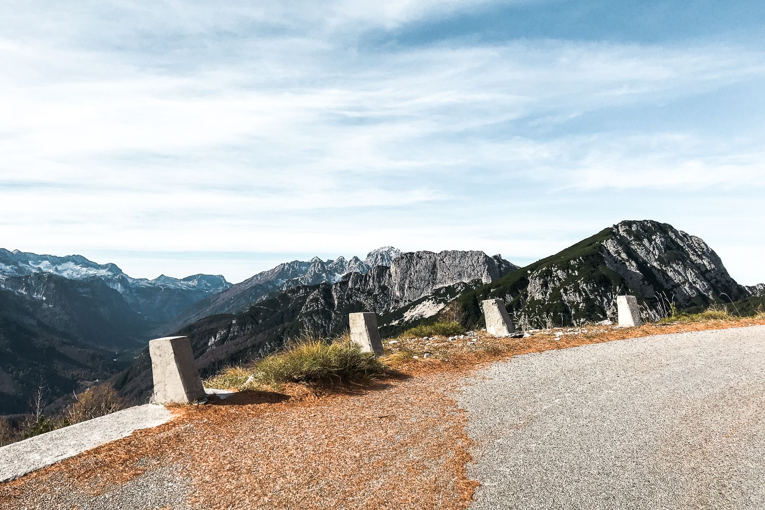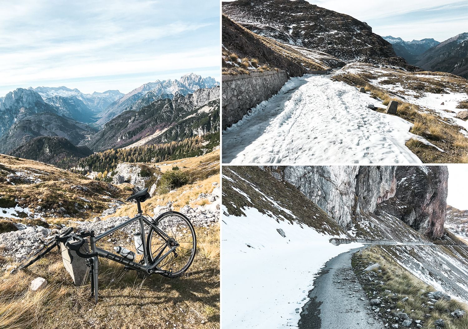 Zadnjikrat, ko sem bil tam, je bil zgoraj že sneg. V tem letnem času ga je sploh v senčnih delih že toliko, da je zelo težko priti do vrha, razen če si dovolj trmast. Meni je kot nalašč malo pred vrhom počila zračnica, tako da mi je za gazenje po snegu že zmanjkalo motivacije. Zračnica je po vsej verjetnosti spustila, ker sem zapeljal na oster kamen, ki jih tak čas po cesti ni malo, ravno zaradi manjšega števila prometa. Pri spustu zaradi hendikepirane zračnice nisem pretiraval, tako pa sem si lahko vzel veliko časa in naredil prenekatero fotko.