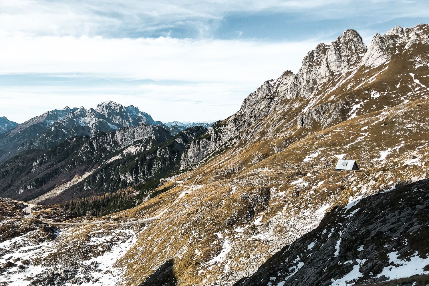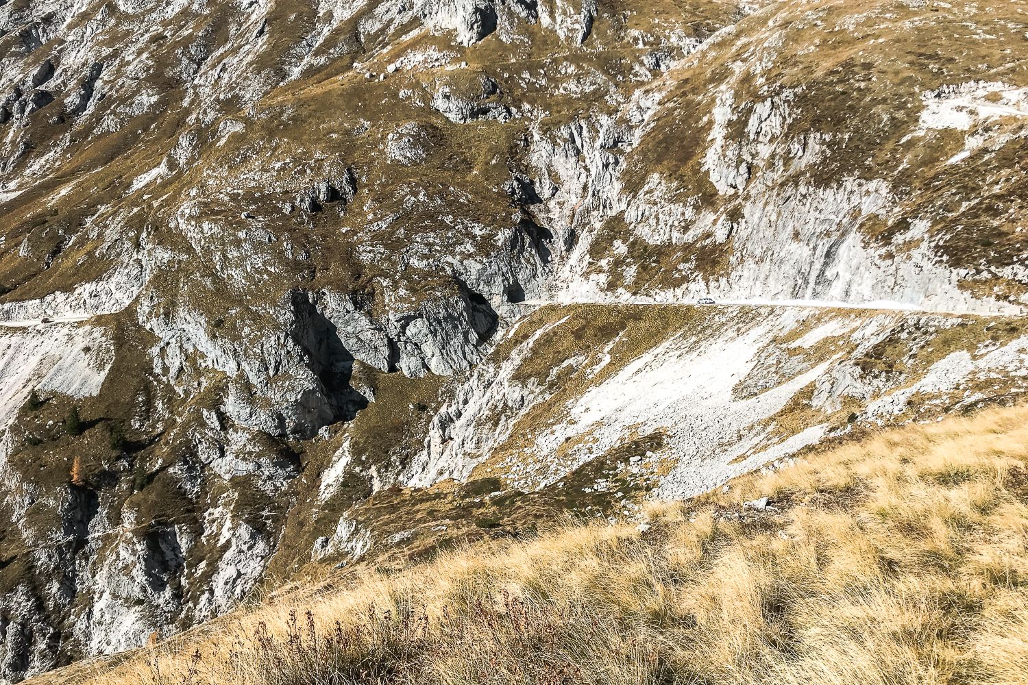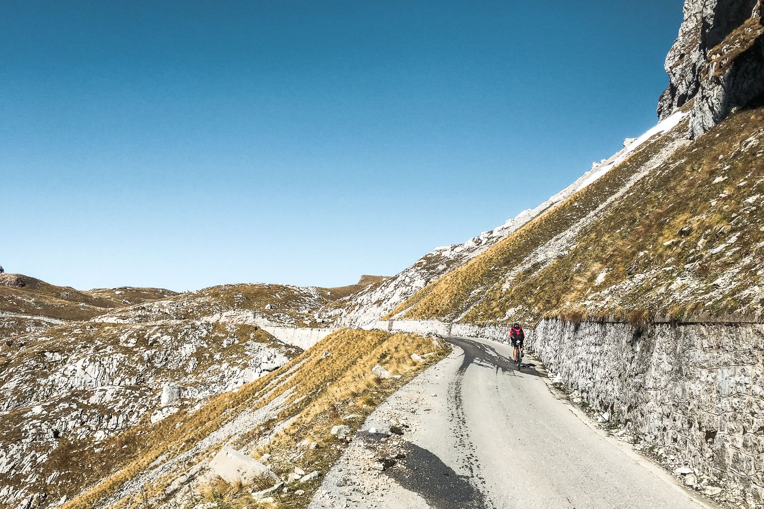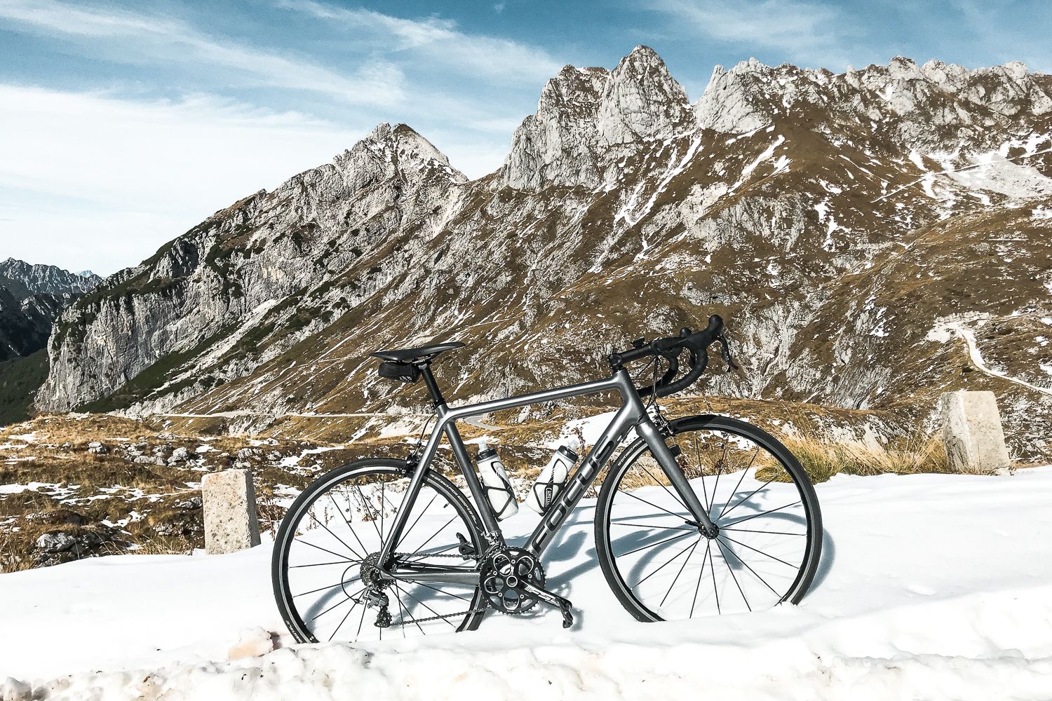 Zadnjikrat, ko sem bil tam, je bil zgoraj že sneg. V tem letnem času ga je sploh v senčnih delih že toliko, da je zelo težko priti do vrha, razen če si dovolj trmast. Meni je kot nalašč malo pred vrhom počila zračnica, tako da mi je za gazenje po snegu že zmanjkalo motivacije. Zračnica je po vsej verjetnosti spustila, ker sem zapeljal na oster kamen, ki jih tak čas po cesti ni malo, ravno zaradi manjšega števila prometa. Pri spustu zaradi hendikepirane zračnice nisem pretiraval, tako pa sem si lahko vzel veliko časa in naredil prenekatero fotko.