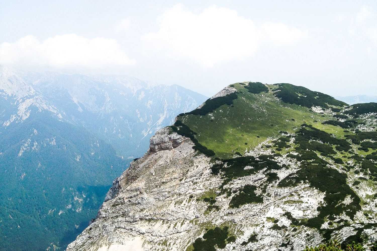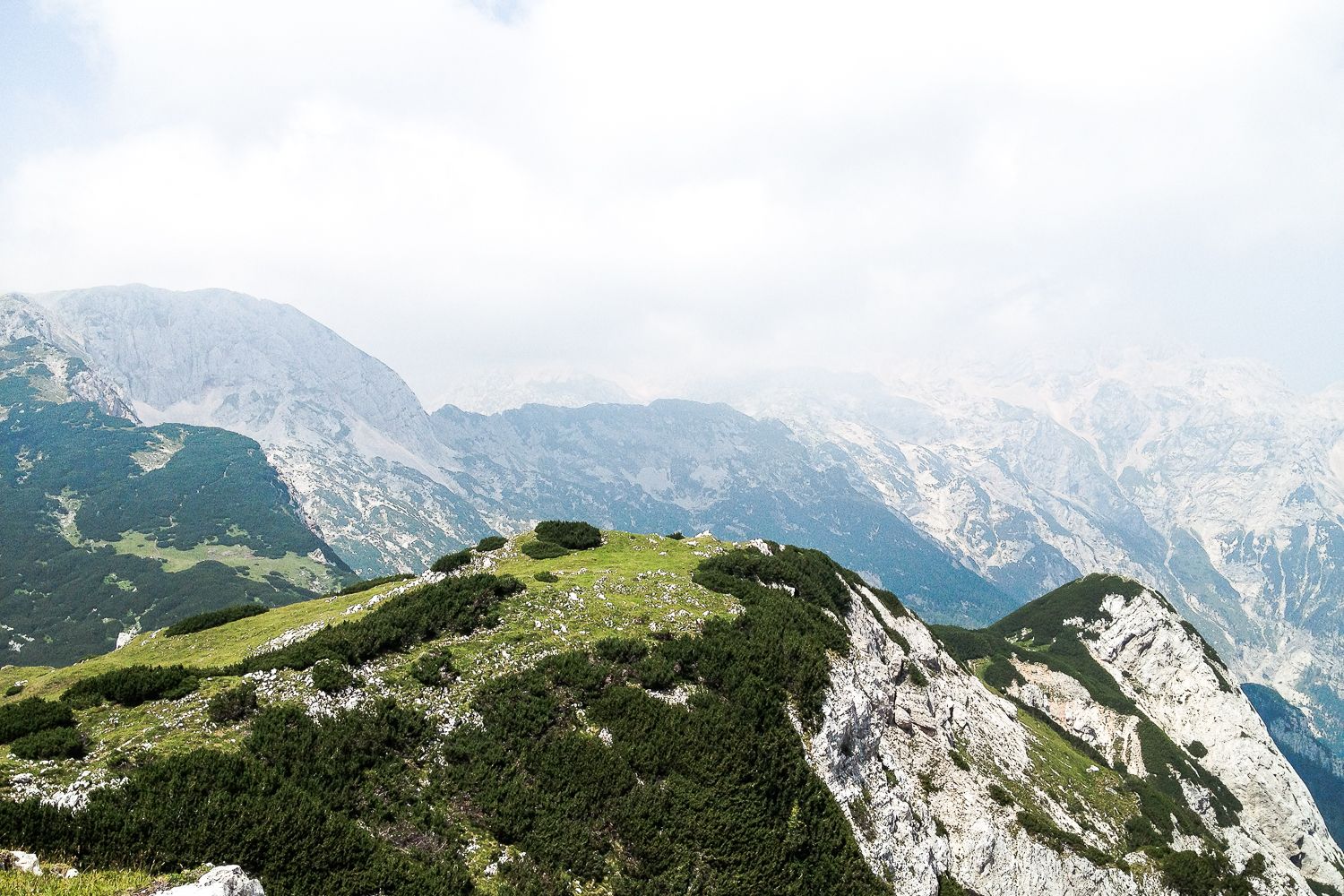 V petek zvečer, nedolgo zatem, ko sva razpakirala najnujnejše in se najedla planinske večerje na žlico, sva v posteljo popadala že pred deseto. A sva bila zato naslednji dan pokonci že zgodaj – čila in pripravljena na osvajanje skoraj dvatisočakov. Po zajtrku, katerega pretežni del sta sestavljala Kekec pašteta in hišni zeliščni čaj, sva jo najprej mahnila na Veliki Zvoh, najvišjo točko krvavškega smučišča, nato pa po grebenu in ozkem, z jeklenico opremljenem žlebu na Vrh Korena, od koder se je odprl megličast razgled na Kamniško sedlo in vrhove Kamniško-Savinjskih Alp. Nazaj se nama ni prav nič mudilo, hodila sva počasi in počivala v travi, dlje in večkrat kot je bilo to zares potrebno.