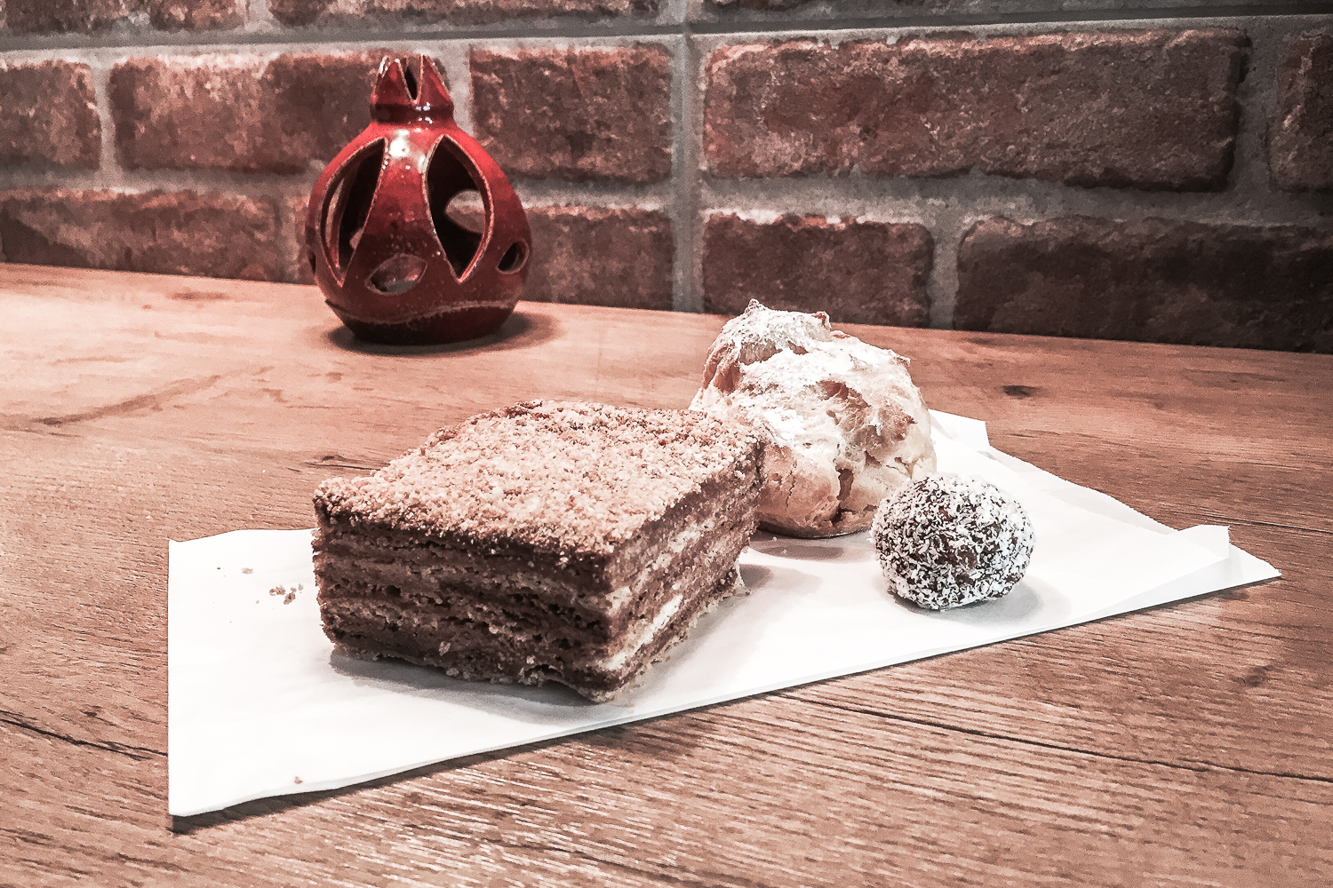V lavaš, tako pravijo spletni viri, je mogoče zaviti marsikaj, pri simpatičnem mladeniču v Ljubljani pa lahko izbirate lahko med mesnim in brezmesnim nadevom, zajetno obloženim z zelenjavo. Poizkusila sva oboje in težko bi se odločila, kateri je bil slastnejši. Še težje je bilo pri sladicah, zato sva vzela kar tri: večplastno medeno torto, okusne čokoladne kroglice ter zaprsteobliznit princes krof, bogano nadevan s fino kremo.