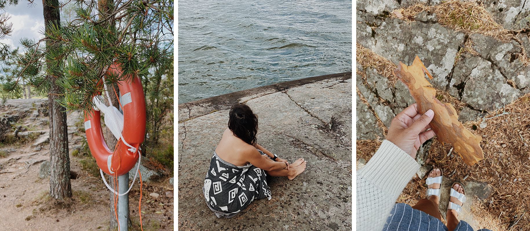 V majhni kavarnici pri pomolu, ki je bila hkrati trgovina s spominki in recepcija majhnega kampa, sva vzela kavo in krofka s kardamomom, nato pa se po posvetu z gospo za pultom odločila za osemkilometrsko krožno pot po otoku. Gospa je rekla, da je pot zahtevna, ampak da ona ne hodi v hribe. Ko sva ji povedala, da najraje pohajkujeva po Alpah, je samo zamahnila z roko in se pomenljivo nasmehnila. Mimo muzeja na prostem – nekdanje kmetije, na kateri so prvi prebivalci zemljo obdelovali s požigalništvom, sva jo mahnila skozi visok, temen gozd, ki se je razredčil šele na pri kurišču na drugi strani otoka.