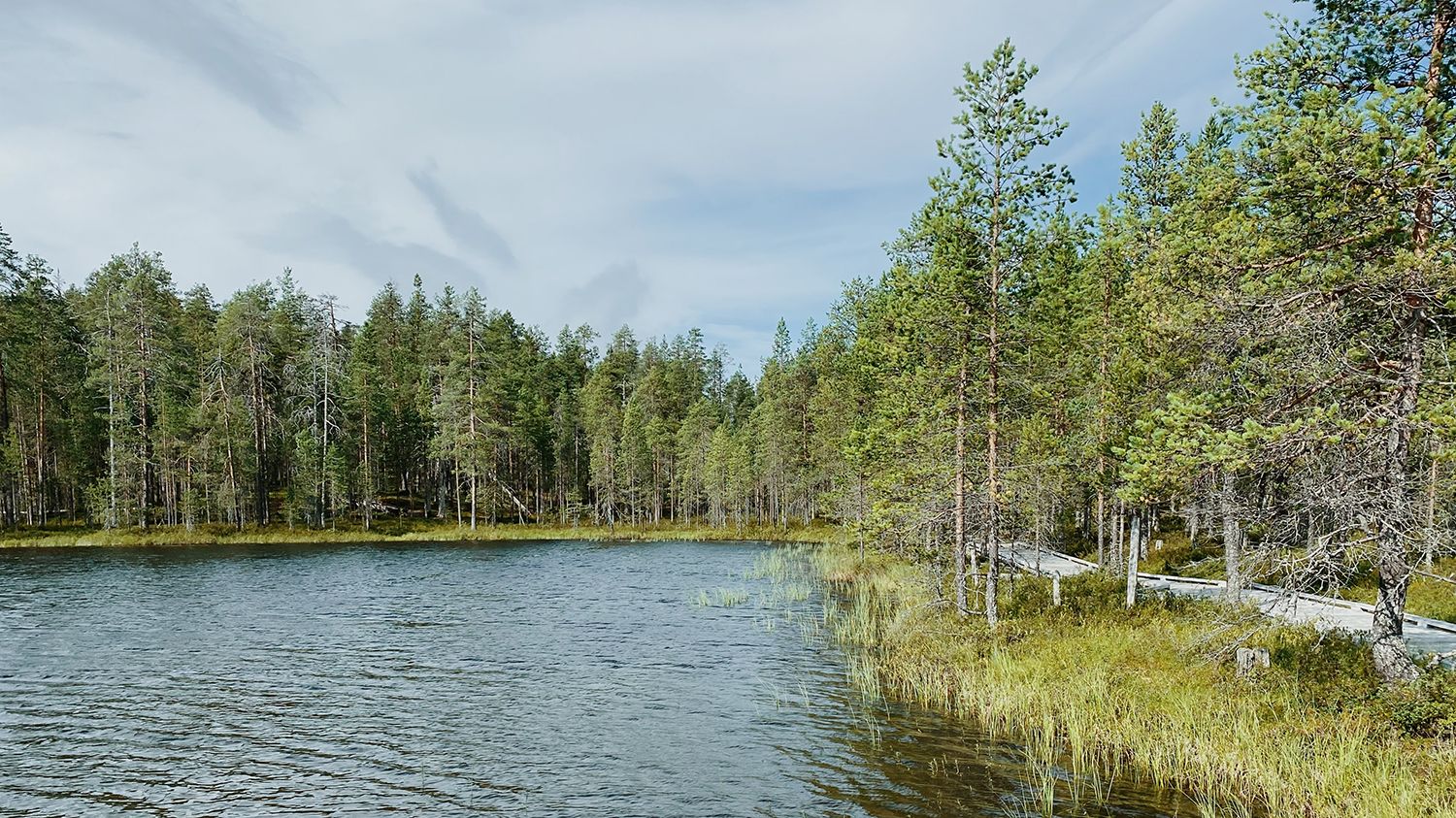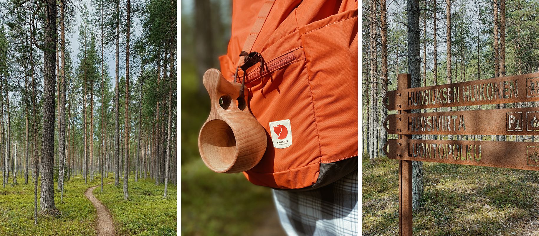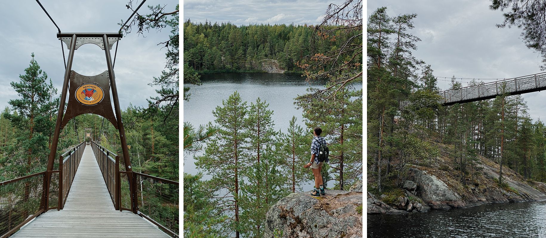 Bil je ponedeljek dopoldan in parkirišče pri centru za obiskovalce skoraj prazno. Že po gozdu, ki naju je obdajal in poteh, ki so izginjale vanj, sem vedela, da bo to moj najljubši park. Informativna tabla je znova ponujala neskončne možnosti pohajkovanja in na koncu sva izbrala dvourno krožno pot okrog jezera Huosiusjärvi. Stilsko dovršeni zarjaveli smerokazi, ki so se do popolnosti zlivali z okolico, so naju najprej po leseni poti usmerili okrog manjšega jezerca, nato pa po stezi naprej v gozd.
