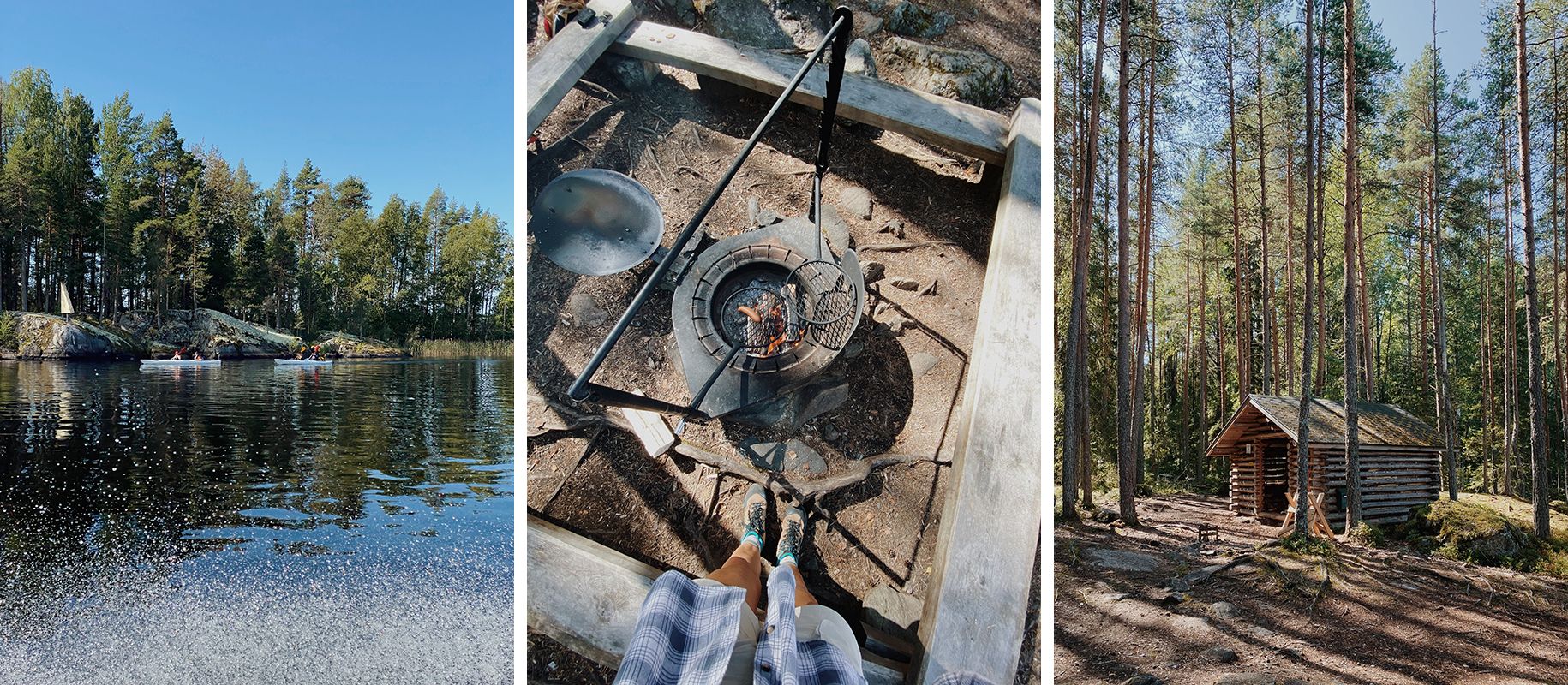 Skozi svetel borov gozd z drevesi, kot bi jih narisal, sva prišla do pomola, kjer je, pripravljen na vožnjo, plaval lesen ročni trajekt. S pomočjo kabla sva se povlekla na drugo stran jezera, kjer sta na prevoz nazaj že čakala dva pohodnika. Kmalu sva zavila navkreber, visoko na skale nad jezerom in se nato znova spustila do močvirnate obale, medtem pa nabirala borovnice, gozdne jagode ter nekaj grenkih brusnic. Na enem od številnih ognjišč ob vodi sva zakurila in spekla klobasice (ki so po tednu prakse zdaj že imele tisto popolno hrustljavo skorjo), nato pa, ker je pihal hladen veter, še kar lep čas posedela ob ognju. Kot da bi vedela, da ob finskem ognjišču sediva zadnjikrat.