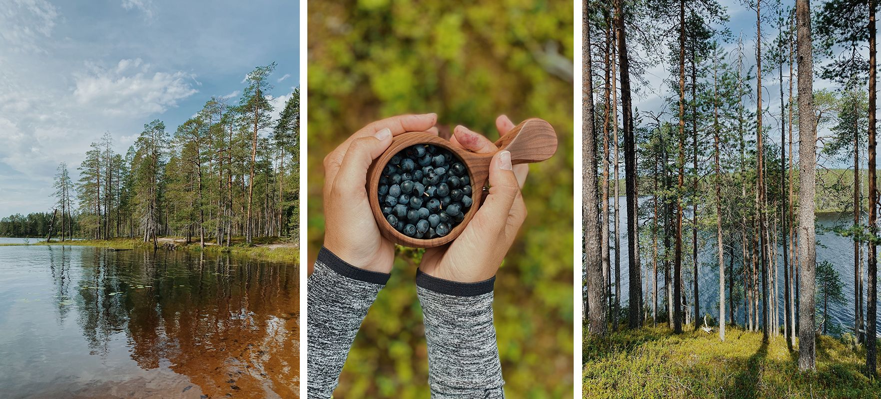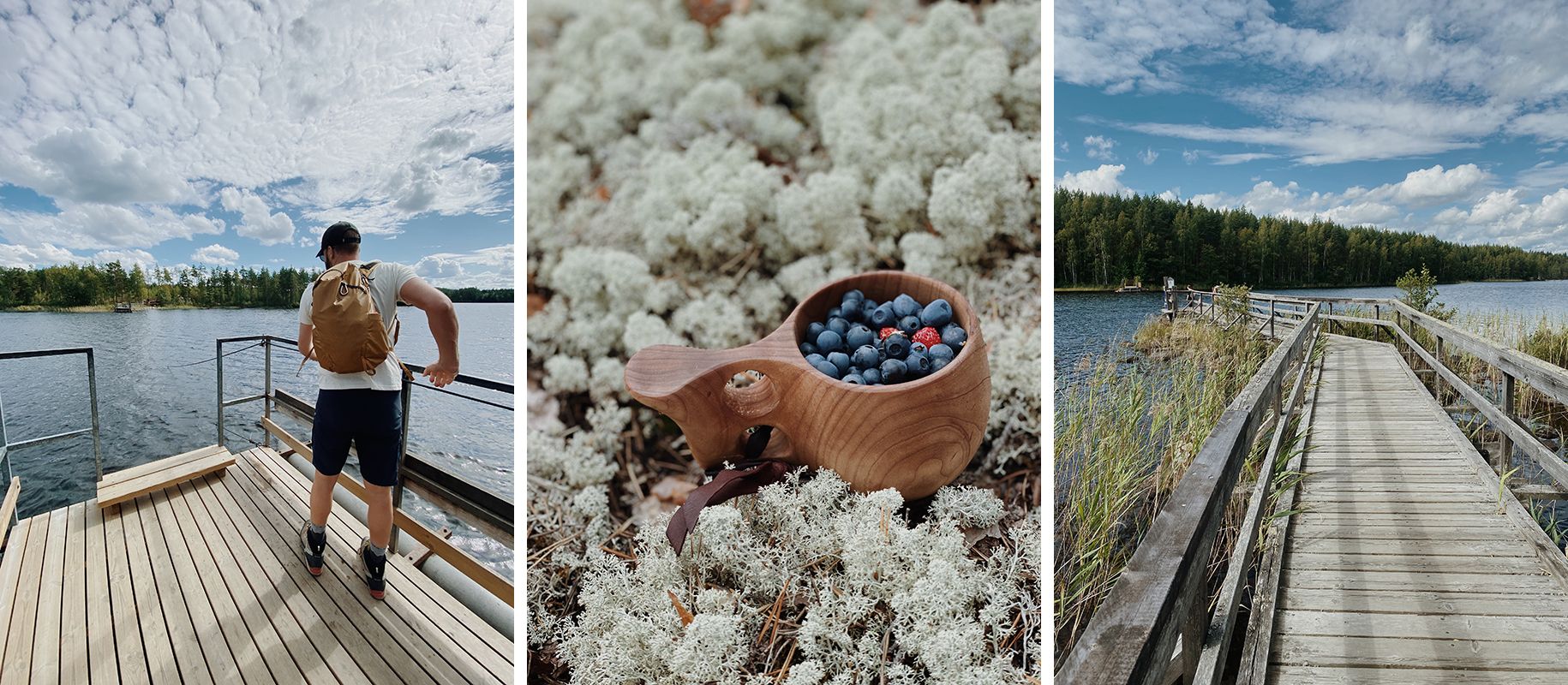 Pot se je dvigala in spuščala, ob njej so rasli brezovčki in turki, pod drevesi pa borovnice do koder je segal pogled. Jedla sva jih z vejic in jih nabirala v kukso in najine dlani so se kmalu obarvale vijolično. Pri enem od kurišč sva srečala italijansko družino, ki na Finsko z avtodomom prihaja že več let zapored, tokrat pa so s seboj prvič pripeljali še belgijske prijatelje. Hossa, so nama povedali, je eden njihovih najljubših parkov. Ker s pripravo in kurjenjem lesa niso imeli veliko izkušenj, jim je Mr. P. nasekal nekaj drv, zakurili smo ogenj in klepetali, dokler se ta ni dodobra razplamtel. V parku so nameravali preživeti več dni, zato se jim nikamor ni mudilo, midva pa sva, vesela, da sva jim lahko priskočila na pomoč, kmalu zatem krenila naprej.