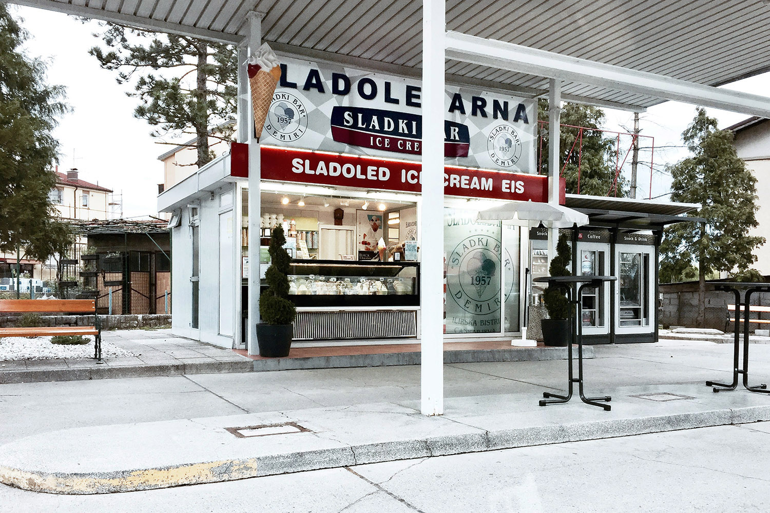 Nekdanjo črpalko, predelano v prodajalno sladoleda, sem opazila tisti trenutek, ko sva v Ilirski Bistrici zapeljala iz krožišča. Posledice so bile neizogibne: v mojem naročju se je znašel največji lonček (naslednji korak bi bila le še banjica) s tremi kepicami kremastega sladoleda, obloženega in prelitega z vsemi možnimi dodatki.