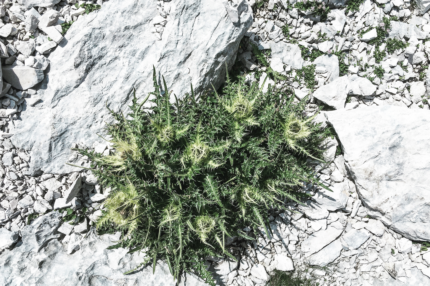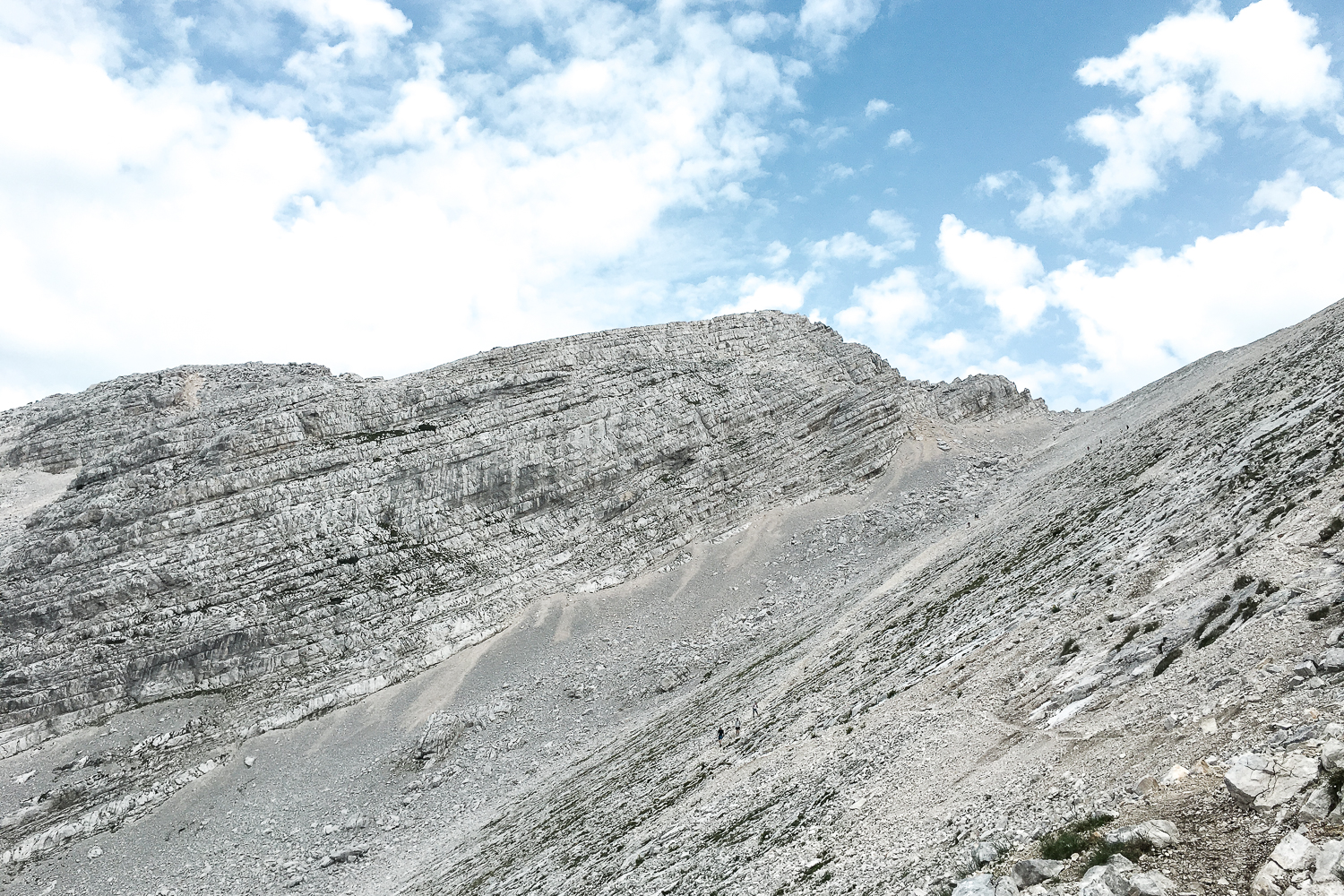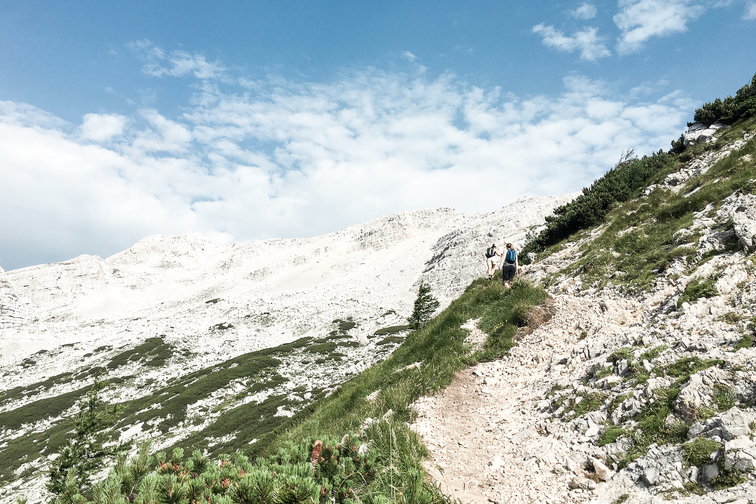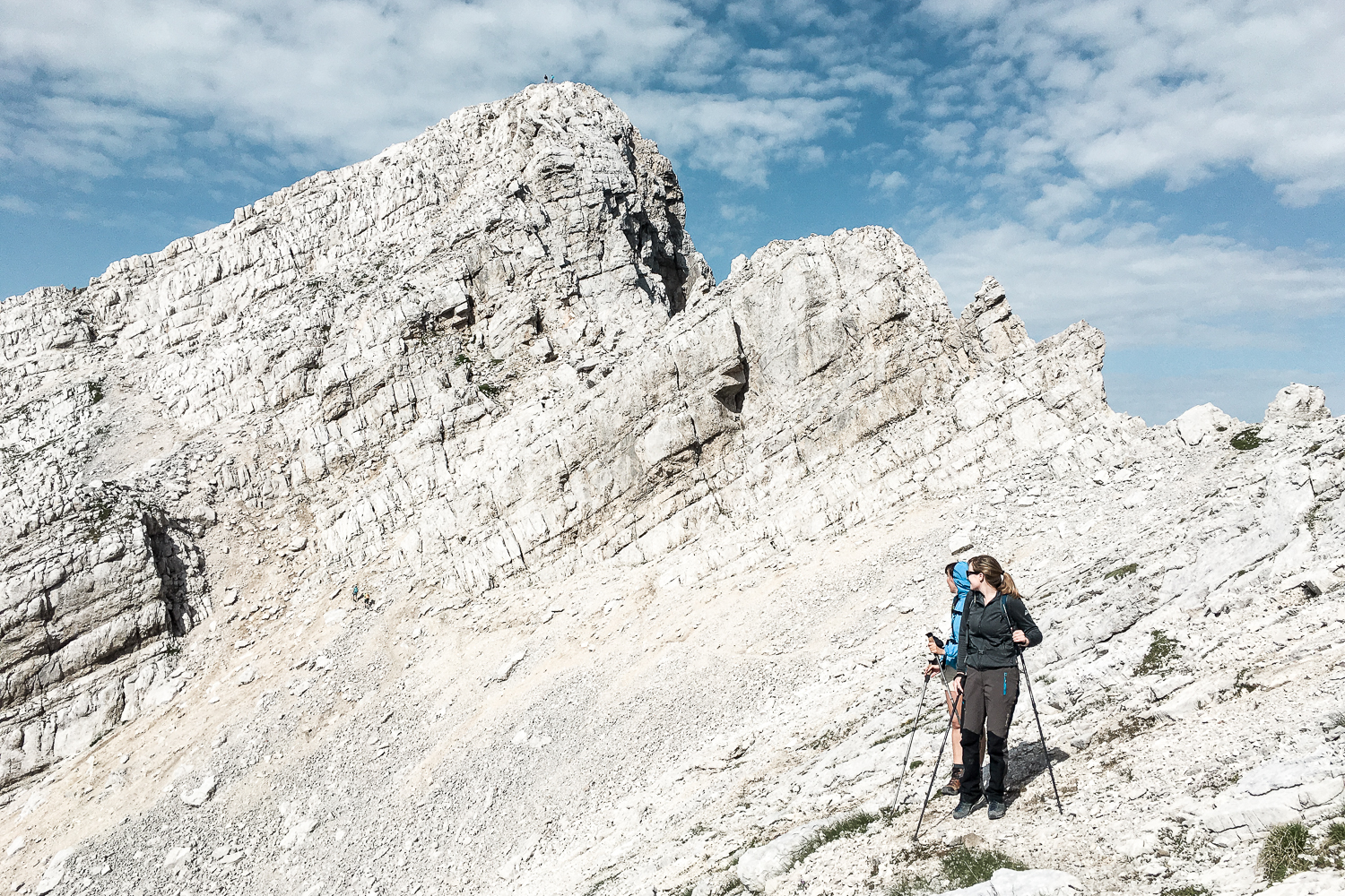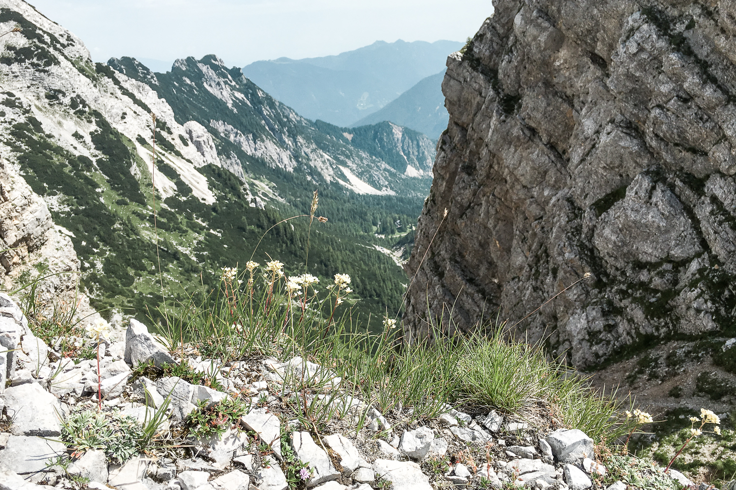 Bilo je sredi poletja, do Putinovega obiska še slab teden, cesta do Ruske kapelice pa temu primerno ravno na frišno asfaltirana. Na Vršiču, ki se je kljub zgodnji jutranji uri neusmiljeno polnil s pločevino, je veter bril, da je bilo kaj, a smo se do melišča in grape nad njim že dodobra razgreli. Sledilo je nekaj ovinkov med nizkim grmičevjem, nato pa smo dobršen del poti grizli kolena po belem, od sonca razgretem grušču, ki ga je Matej vztrajno imenoval grušt.