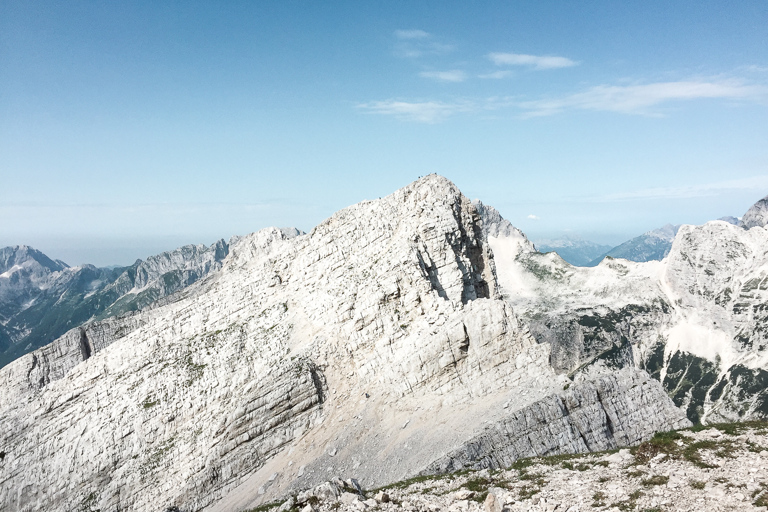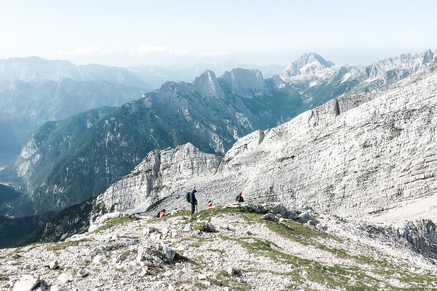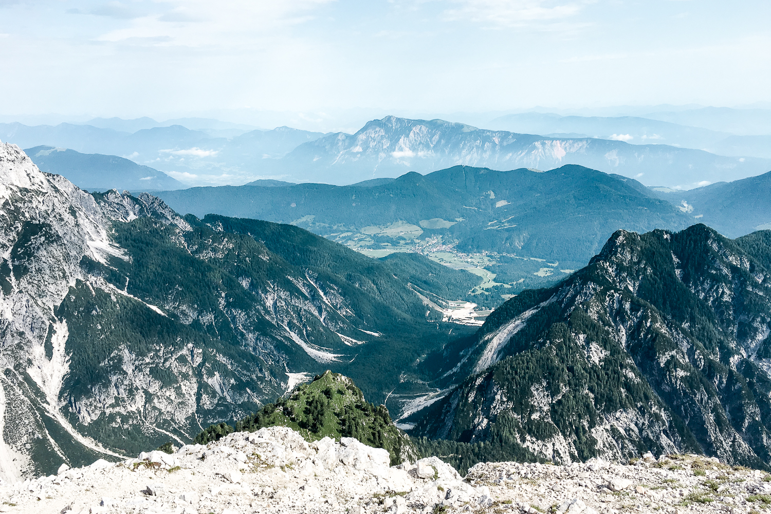 Razgled z vrha je bil malodane fantastičen: iz meglice je štrlel Triglav, pred nami se je pela Velika Mojstrovka, v daljavi se je raztezal Dobrač, v dolini pod Poncami pa so adrenalinski navdušenci uživali v poletnih aktivnostih.