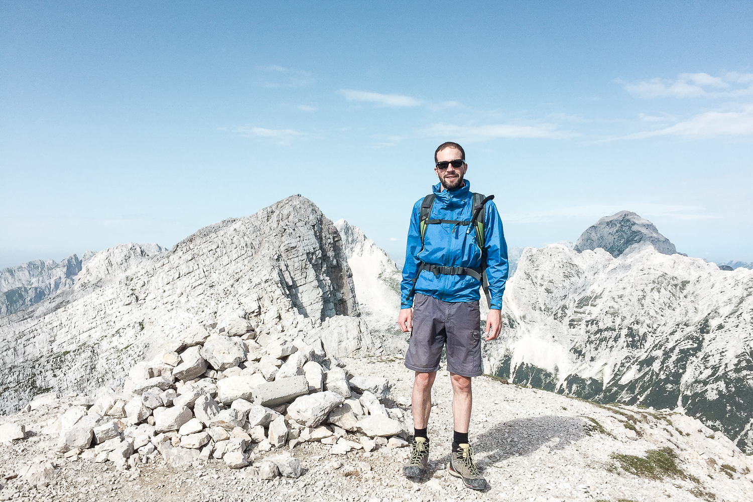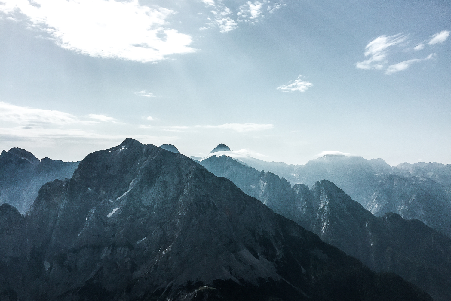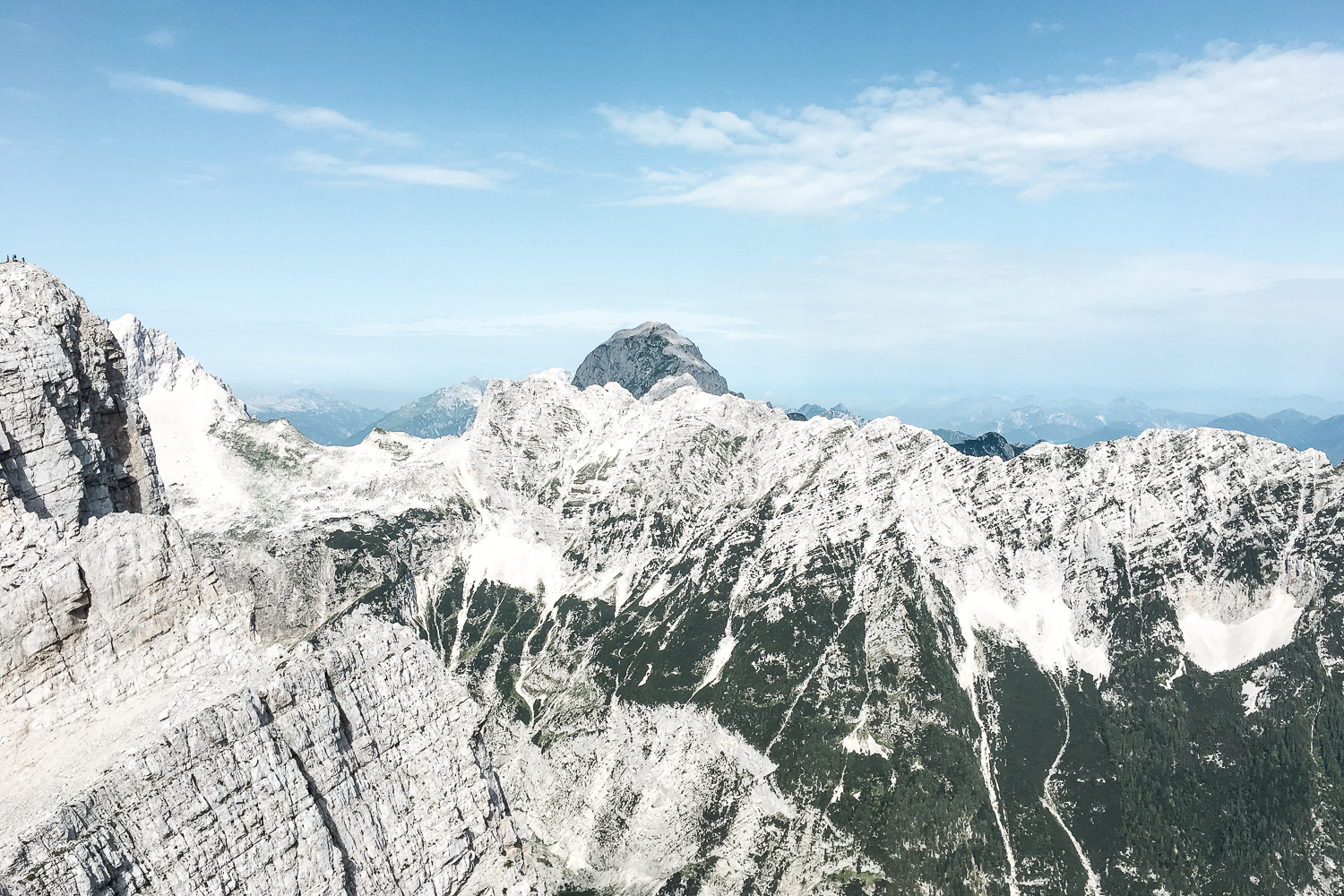 Razgled z vrha je bil malodane fantastičen: iz meglice je štrlel Triglav, pred nami se je pela Velika Mojstrovka, v daljavi se je raztezal Dobrač, v dolini pod Poncami pa so adrenalinski navdušenci uživali v poletnih aktivnostih.