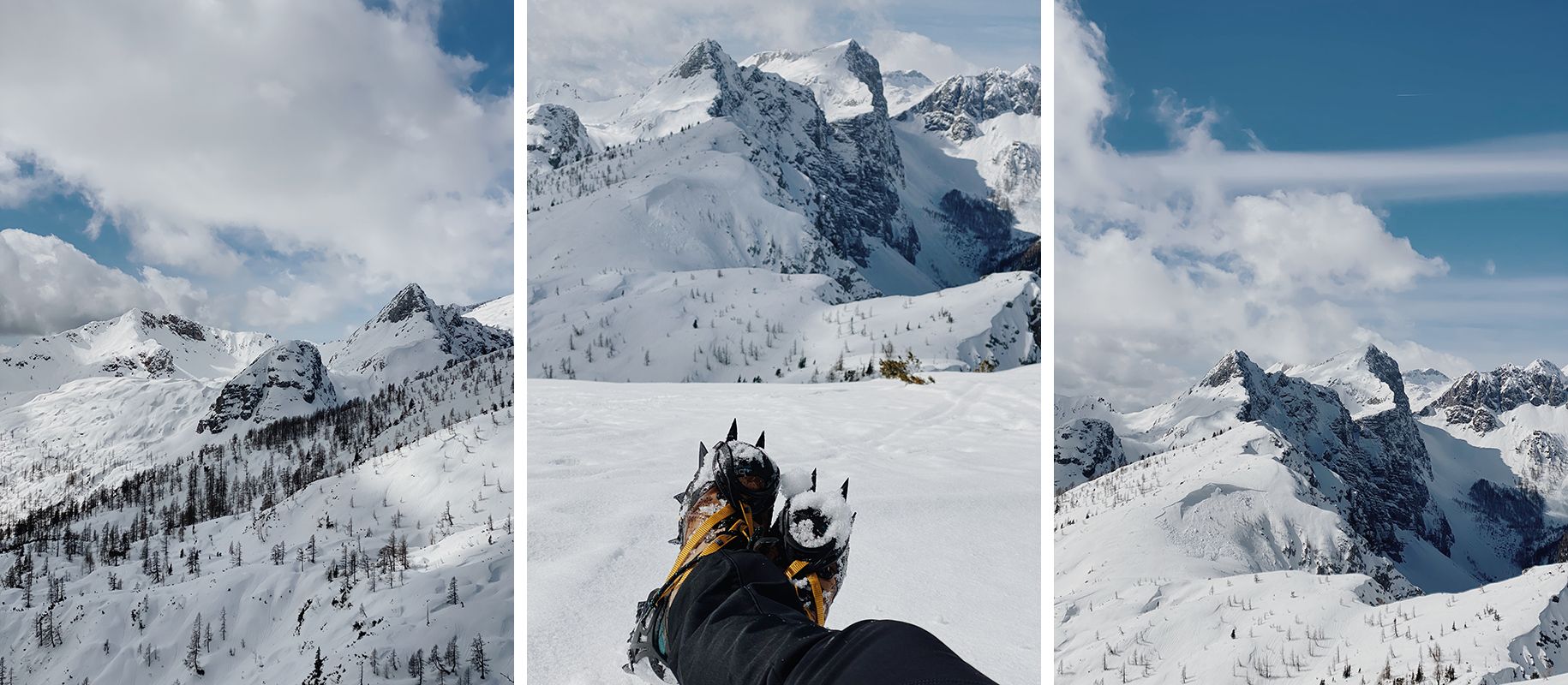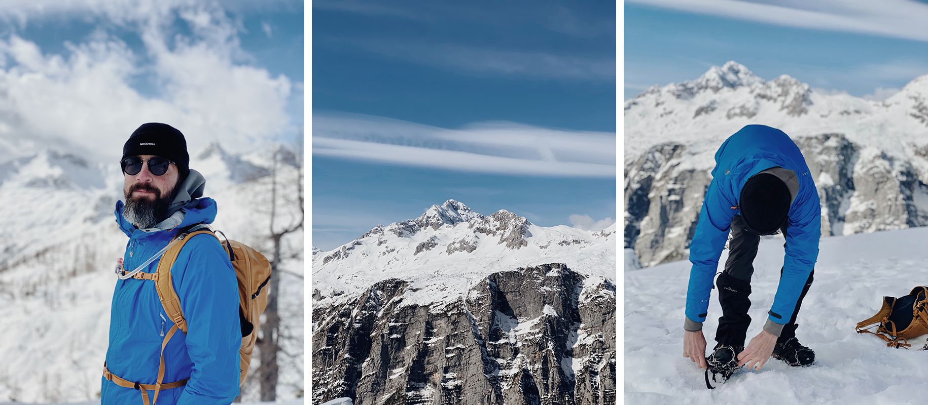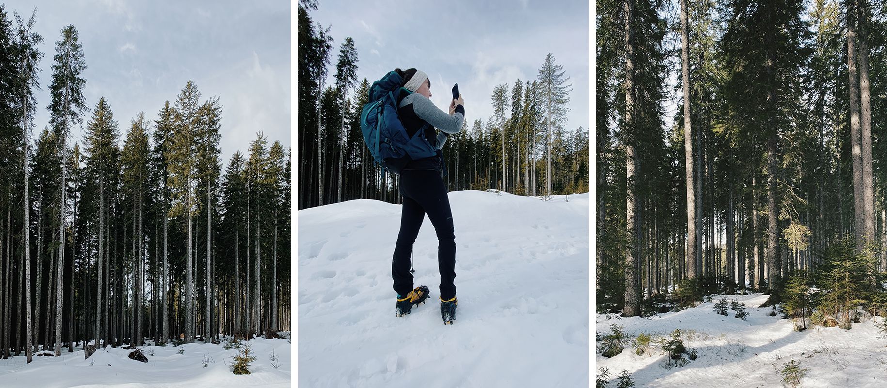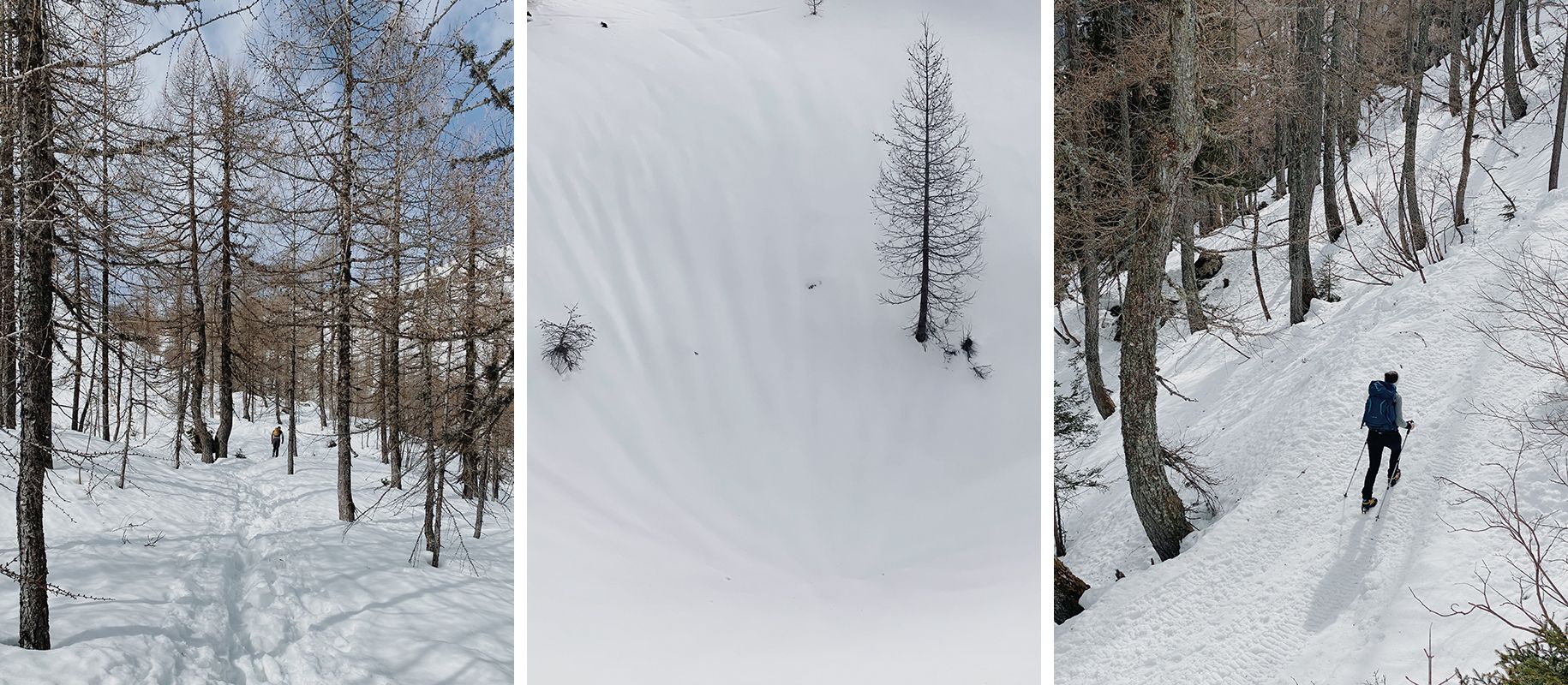 Sredi marca je na Bledu vladala že čisto prava pomlad in tudi ko sva nato vozila proti Pokljuki, se je sprva zdelo, da tam ne bo nič drugače. Malo pred Rudnim poljem sva končno zagledala prve zaplate snega, a se je ta na cesti zares pojavil šele, ko sva zavila proti planini Zajavornik. Jutranji žarki, ki so se počasi prebijali skozi gost smrekov gozd, so osvetljevali zeleno-bela gozdna tla in ko sva na izhodišču parkirala avto, je bilo snega na poti ravno dovolj, da sva si že kar takoj nataknila dereze. Jutro je bilo hladno in steza ponekod še pomrznjena, na mestih, ki jih je že doseglo sonce, pa sneg kašast in drseč, zato je bila odločitev kar prava. Za manjšo skupino turnih smučarjev sva jo počasi mahnila navkreber.