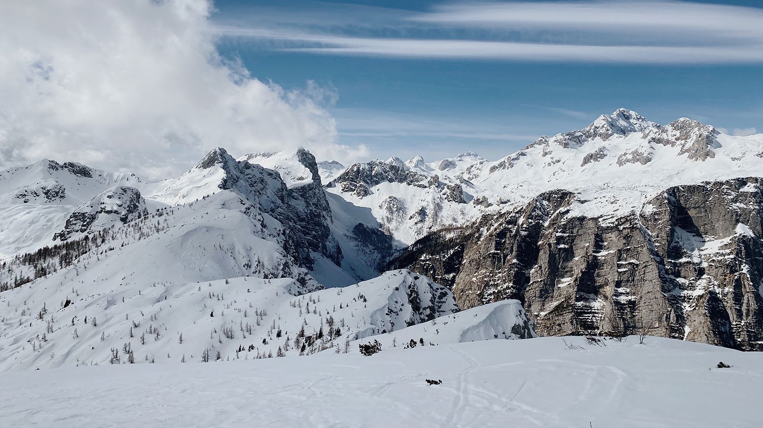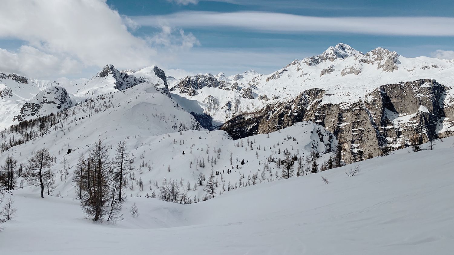 Nato sta se skoraj istočasno zgodili dve stvari: strmina je popustila, pred nama pa se je odprl pogled na najvišje vrhove Julijcev. Z enega od hribčkov pod Viševnikom se je spuščala skupina smučarjev, za njim so se dvigali strmo odrezani Tošc ter Mali in Veliki Draški vrh, Triglav pa je ravno v tistem trenutku preletel helikopter. Mrežce sva dosegla po nadaljnji debeli uri hoje. Pred nama se je raztezal rob pokljuškega grebena, ki se je na severni strani strmo spuščal v dolino Krma, v daljavi, na njegovem nasprotnem koncu, sva prepoznala Brda in Debelo peč. Pokrajina, čez in čez odeta v belo, je bila kot iz pravljice.
