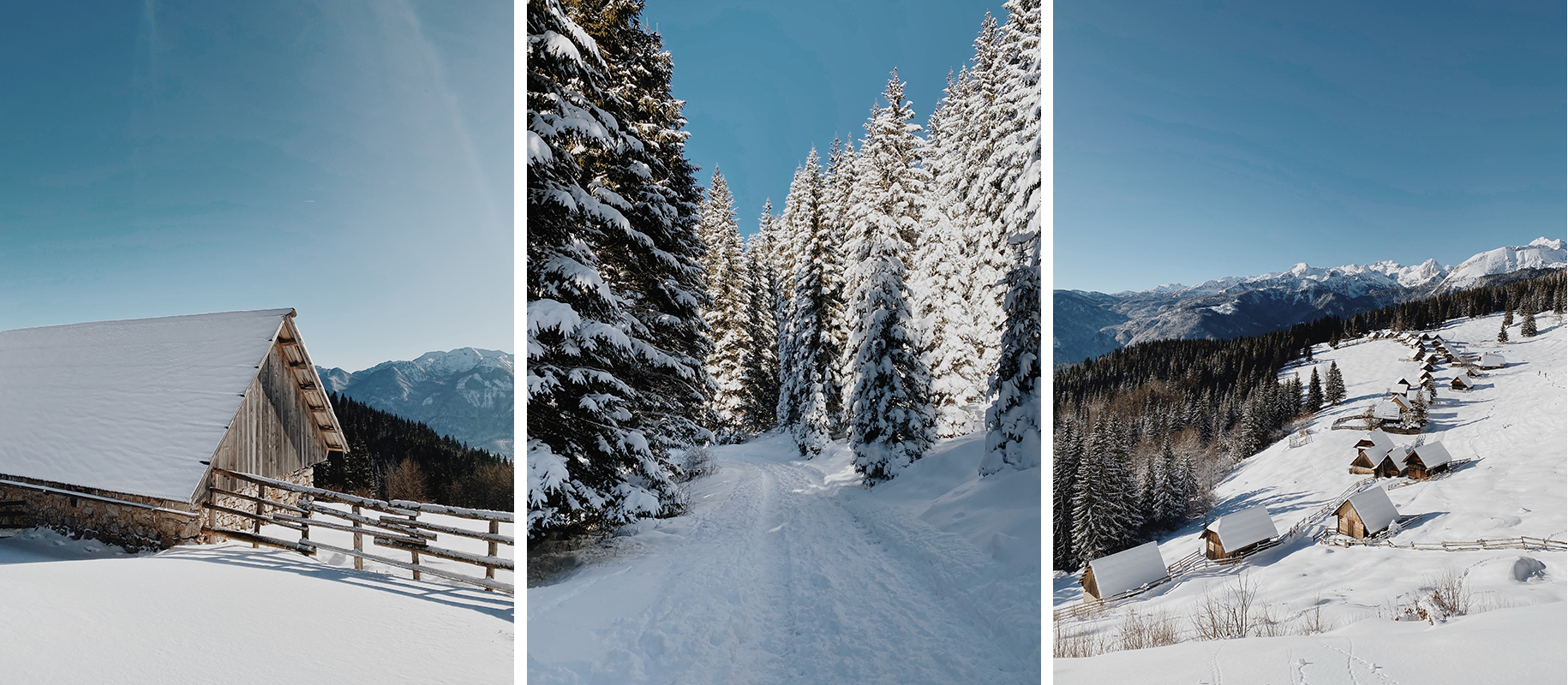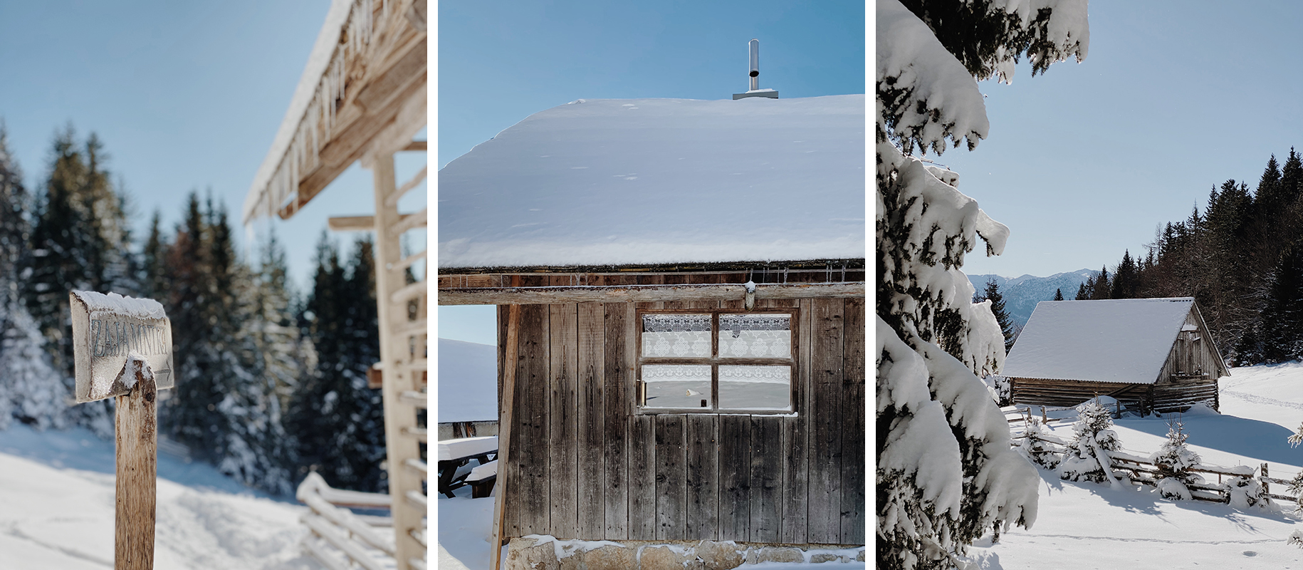 Pot je bilo praktično nemogoče zgrešiti: pred mano se je med s snegom obteženimi smrekami odpiral širok, shojen kolovoz, ki je vodil do planine Uskovnica, nekje na pol poti do tja pa se je v gozd in rahlo navkreber, odcepila nekoliko ožja in občutno manj obljudena gaz, ki je peljala na planino Zajamniki. Na poti, ki se je zdaj vzpenjala, zdaj spuščala, sem srečala le peščico ljudi, nato pa po dobri uri hoje dosegla rob planine. Iz nobene od koč se ni kadilo, gaz je po levi stani obšla pastirsko naselje in se vzpela na hribček nad njim, od koder se je odprl najlepši (in najslavnejši) razgled na planino. Tam se je drenjalo nekaj pohodnikov, veliko preglasnih, da bi se v njihovi bližini zadrževala predolgo. Kar po celem snegu sem se kmalu zatem spustila do vasice in se sprehodila med zasneženimi hiškami, zaradi katerih se je spomin mojega telefona hitro drastično zmanjšal. V vasi je vladal popoln mir in ob pogledu na zasnežene Bohinjske gore v ozadju je bilo vzdušje zares idilično.