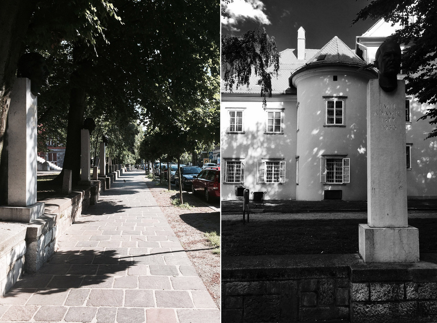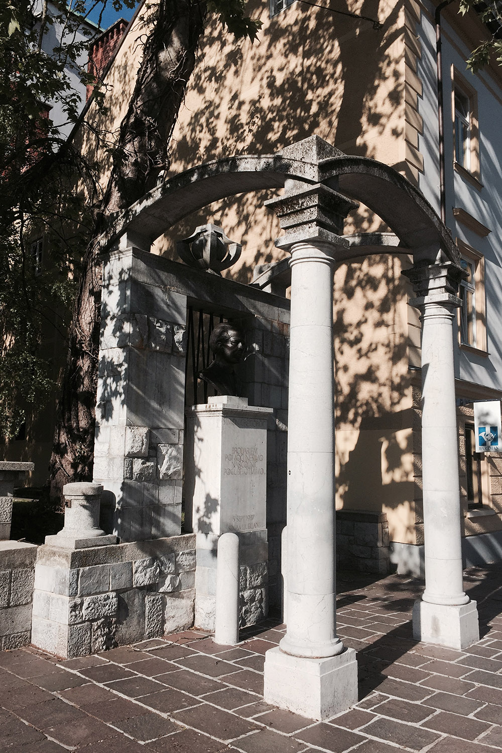 Ob zaključku aktualno spornega bukovega drevoreda stoji spomenik Simonu Gregorčiču z danes kamnito, nekoč pa leseno pergolo, po kateri se je kot simbol primorstva nekdaj vzpenjala vinska trta. Na kratko smo se zaustavili pri Napoleonovem spomeniku, edinemu spomeniku Napoleonu na svetu, postavljenem v dvajsetem stoletju, vrgli oko na kiosk čez cesto, mojstrovino, za katero mora človek, tako Miklavž, če si jo želi dobro ogledati, stopiti na drugo stran ulice, sledili sta kitica ali dve, zatem pa smo pohod skozi Križanke ( tam sem si prvikrat od blizu ogledala leseni model paviljona na Brionih, ki danes služi kot lestenec v gostinskem lokalu in pri zasnovi katerega je Plečnik uporabil nikoli uresničeni načrt za Prešernov mavzolej v Vrbi) in Krakovo zaključili na vrtu Plečnikove hiše v Trnovem.
